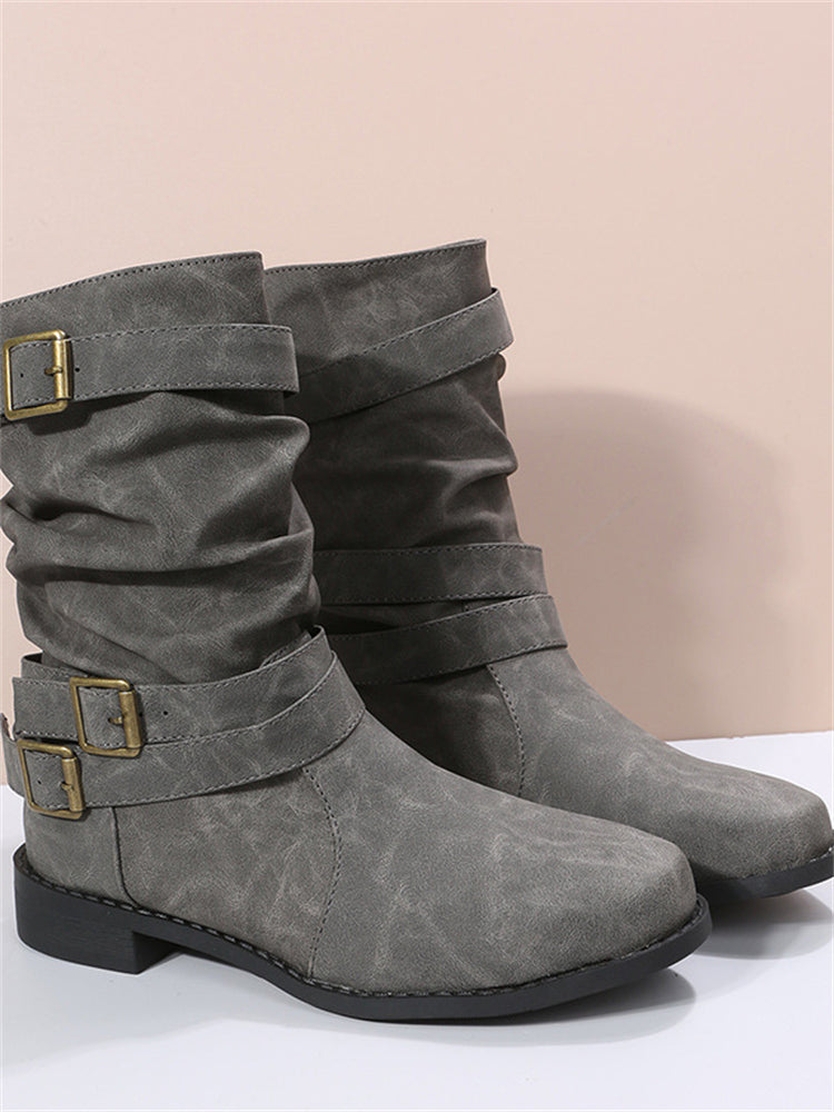 Vintage Buckles Stacked Calf Boots