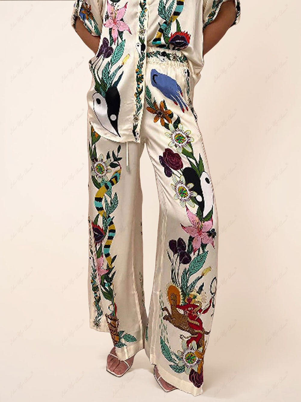 Satin Unique Print Pocketed Wide Leg Pants