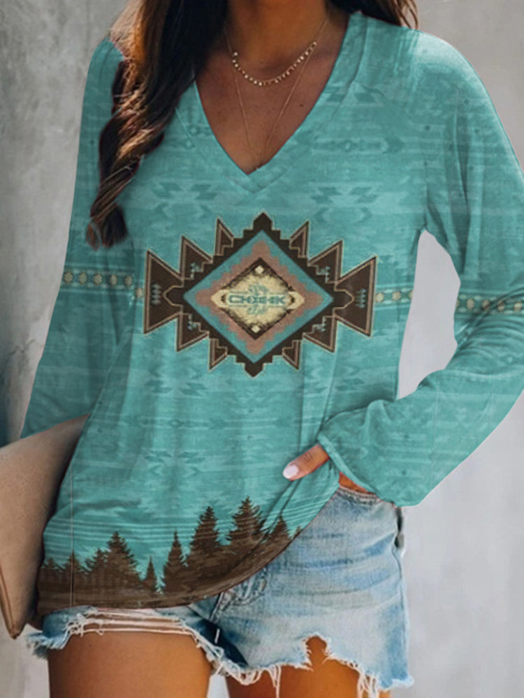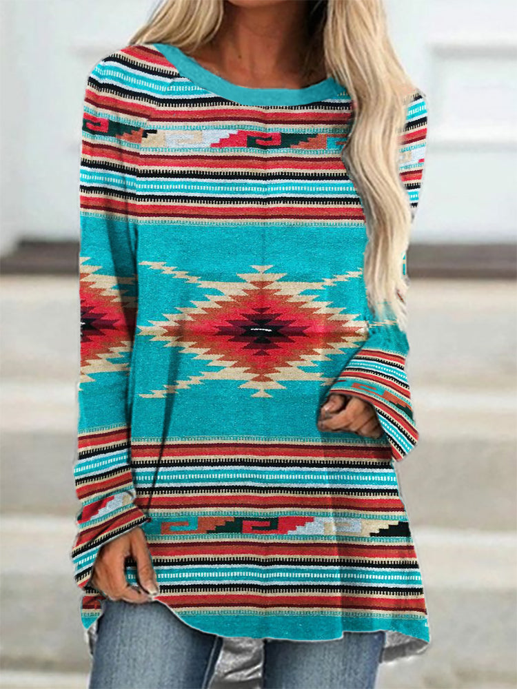 Western Print Casual Crew Neck Long Sleeve Tunic