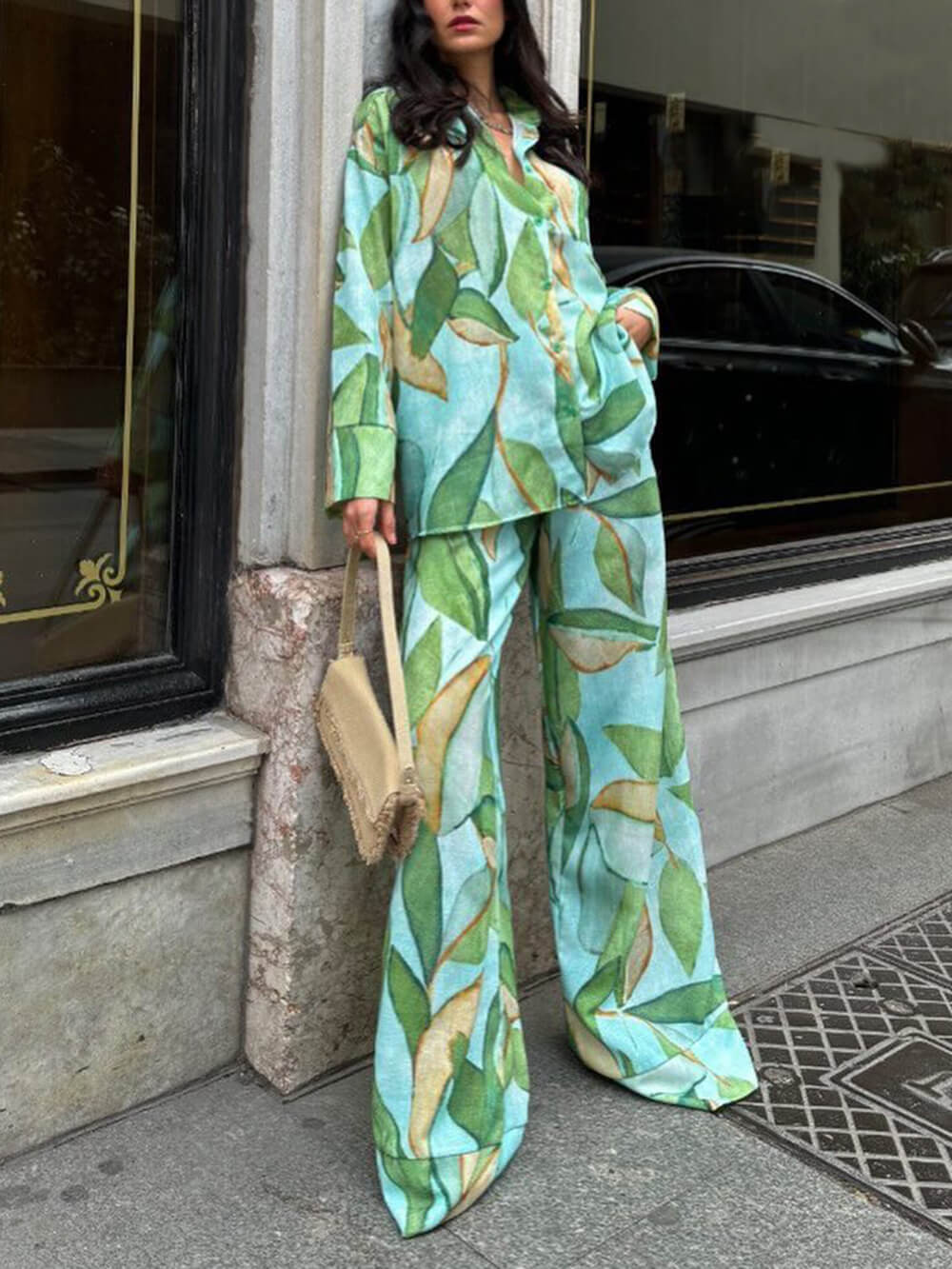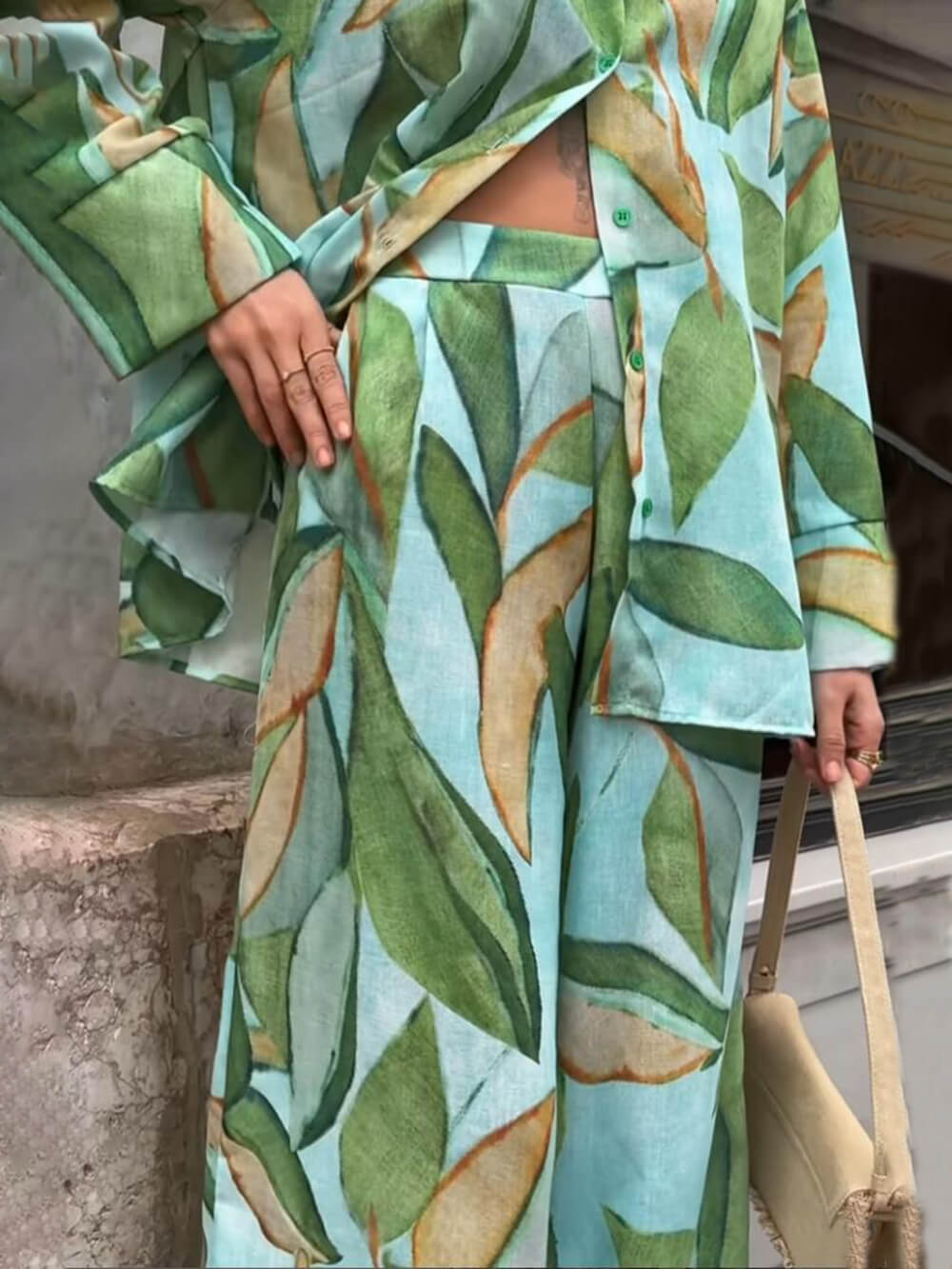 Transform any outfit into a sophisticated, luxurious piece with these sophisticated and unique palm leaf print elastic pocket wide leg pants.